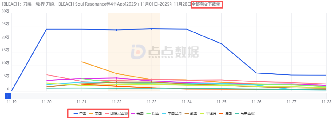 截止目前,游戏公测8天累计下载量约为415.4万(首周下载量为393.3万),中国大陆iOS端、美国、印尼以37.68%、8.92%、8.87%的占比位列前三,以平台来看,APP Store占比略高为63.35%;