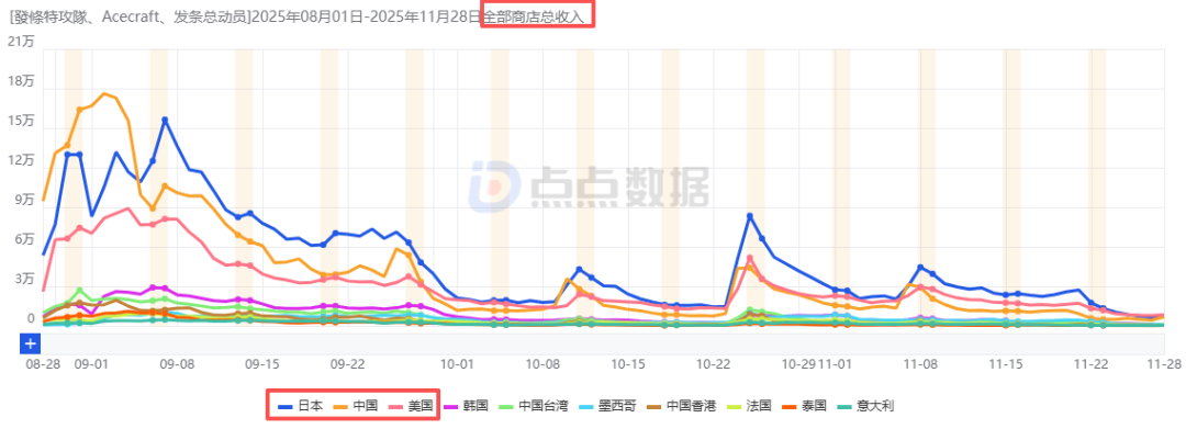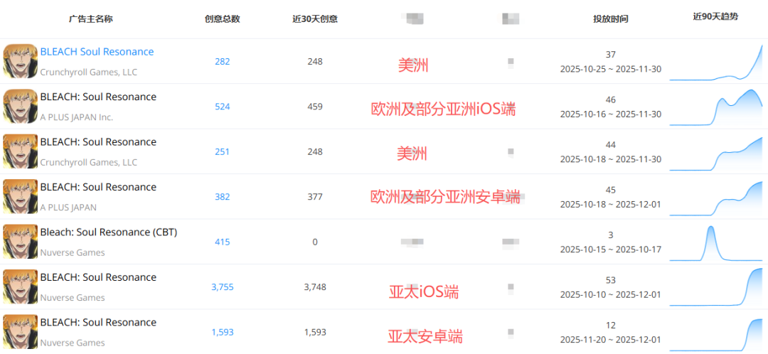 买量方面则是明显倾斜于IP的核心辐射市场,该作最早于今年10月中旬才开始投放(公测前一个半月),公测前两天投放力度才开始明显拉升,亚太地区是其投放量最大的区域,欧美则不够给力,而这也与流水的区域分配几乎一致;