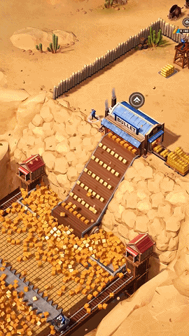 ①收割资源打造防御基地。《West Game II》热投素材中,这类素材投放量最多。创意素材展示玩家在西部牛仔世界里进行资源收割,然后建造防御建筑,用于抵御敌人的进攻。