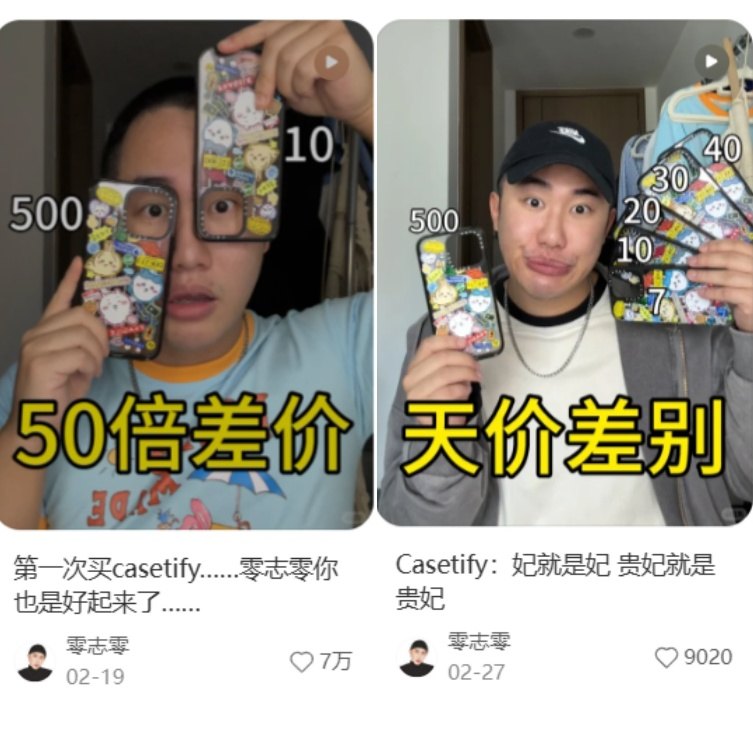 博主“零志零”在今年2月发布了一则“相差50倍的正版CASETiFY与山寨版”的视频,点赞量超过7万,而平日他的视频点赞量往往不过千。为了复制这场流量,他在一周后又制作了一条类似视频,得到了近万点赞量,可见这一题材在网络上的话题度颇高。