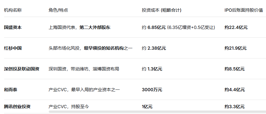 风投机构中最有代表性的是红杉中国,这家国内头部市场化VC,最早领投摩尔线程,投资成本约2.38亿元,IPO后账面持股市值约21.9亿元。