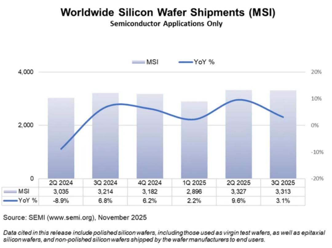 从SEMI最新数据来看,全球硅片市场正在经历缓慢但明确的复苏。2025年第三季度全球半导体硅片出货面积达到33.13亿平方英英寸,同比增长3.1%。虽然环比2025年第二季度微降0.4%,但同比增长的趋势表明市场正在从2024年的低谷中逐步恢复。