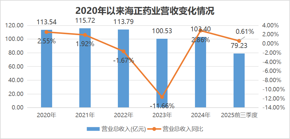 2025年前三季度,海正药业营收为79.23亿元,同比微增0.61%,虽然终结了自2022年以来的连续下滑态势,但归母净利润仅为4.61亿元,同比下滑10.55%。