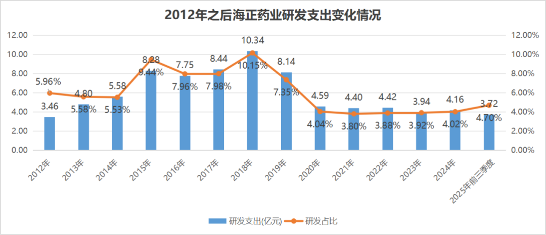 然而,创新药研发需要持续投入和战略定力。自从2018年老董事长白骅离任后,海正药业在7年间换了五任董事长,频繁的人事变动使得创新药研发难以持续。研发支出也从2018年的高点一路降至2024年的4.16亿元,研发占比从超10%,到现在多年不足5%。