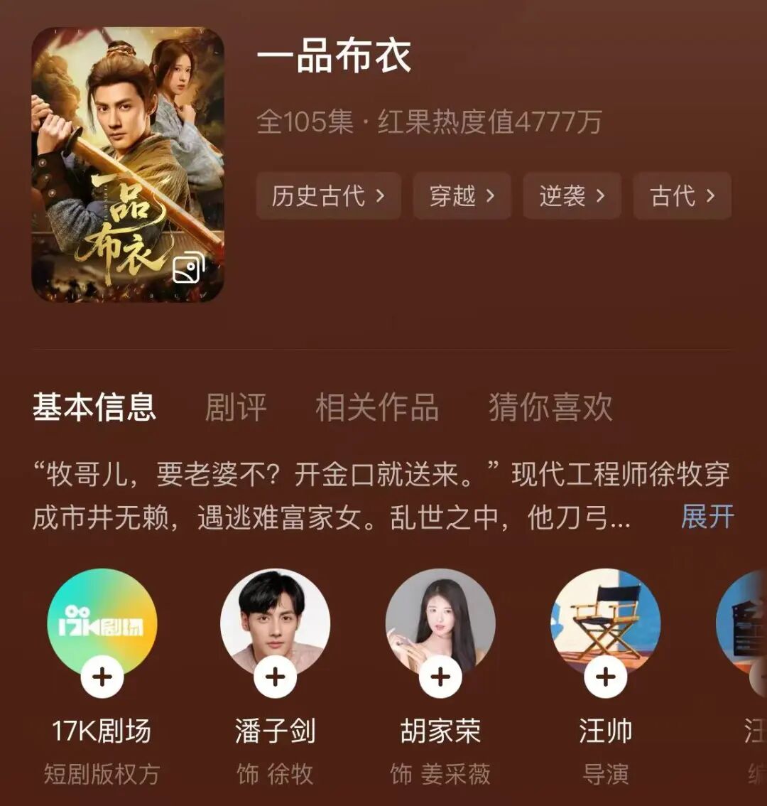 红果救男频则是另一种解题思路,不追求大制作,而是中等IP。《冒姓琅琊》虽然原著有一定口碑,但是走的是考据脑洞加小众审美的路子,即便被历史爱好者吹有不输长剧的质感,但它显然不是那种买版权要开发布会的超级IP,更像细糠里的尖子生。红果也披露过,自己改编的池子就是番茄版权库——早在2024年,光红果自制剧,就有321部是网文改编而来,典型批量开发中腰部IP的打法。而这部剧的制作方格物致知,在此之前也只有一部《一品布衣》,而非那种已经出名的超头公司。
