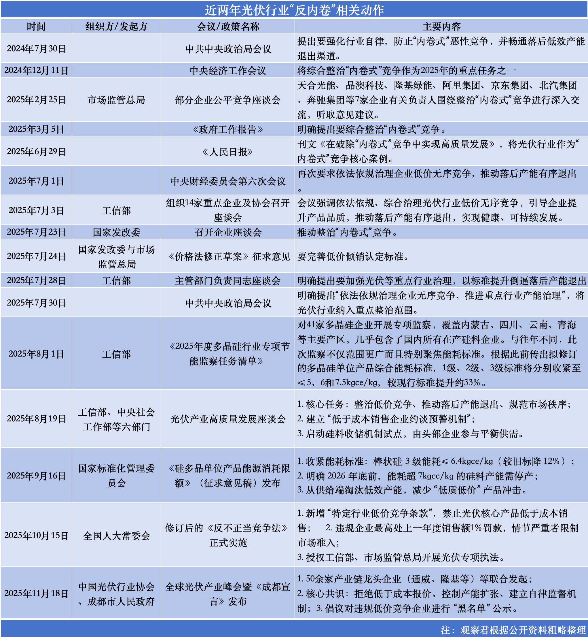 市场、业绩重压之下,中央层面接连高调发声,频频强调要严厉遏制恶性竞争、重塑公平有序的市场环境,“反内卷”的号角在包括光伏在内的多个关键行业吹响。尤其7月以来,光伏行业进入“反内卷”攻坚战。