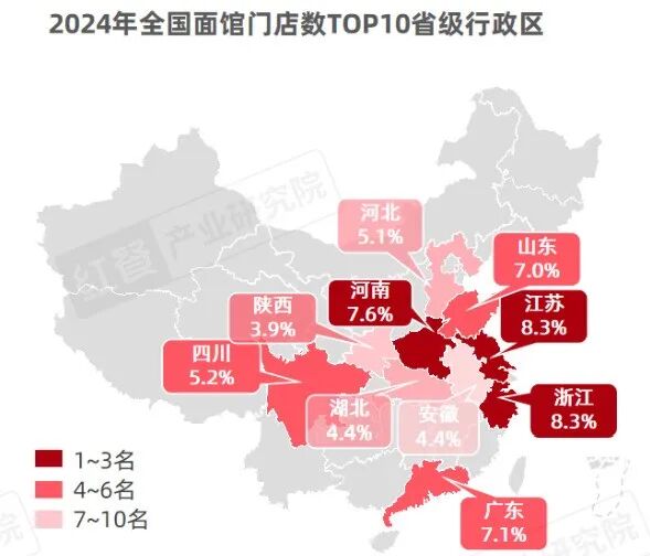 2024年,从区域分布来看,我国面馆门店主要集中在华东一带,占比达到35.1%,华中、西南、华南、华北的占比也较高,分别是13.8%、12.7%、12.3%、11.0%。而拥有“挂面第一股”的湖南,至今还没有跑出有较高知名度的面馆品牌。