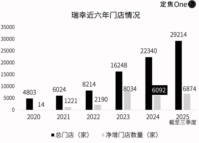 而后财务数据也出现波动,在2025年三季度财报中,瑞幸营收同比增长50.2%,净利却同比下降2%,陷入增收不增利局面。这背后是成本与扩张的双重压力:一方面,外卖大战带动第三方订单激增,直接推高配送费用同比暴涨211.4%至28.9亿元,进而拉动总运营费用同比增长57%至135.1亿元;另一方面,虽然瑞幸仍保持可观的扩店势头,但相较于2023年的高速扩张,门店增速已明显放缓。