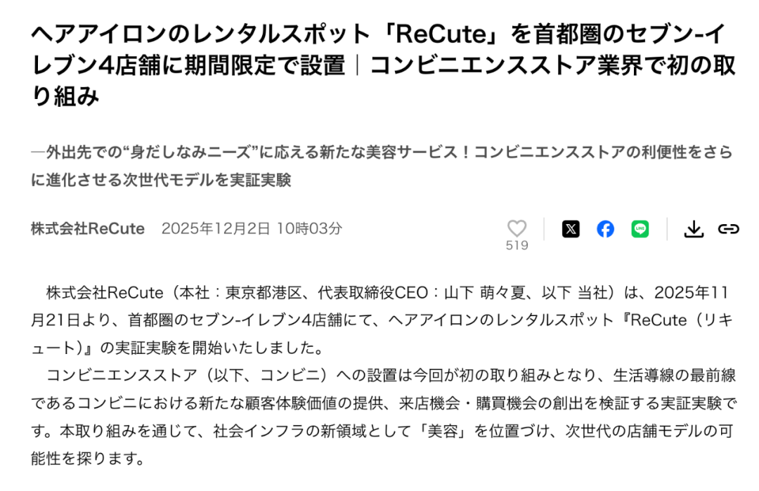 以自11月21日起日本7-ELEVEn与ReCute合作推出的“美发器租赁服务”为例,该项服务乍看只是多了一台设备,本质上却是对便利店角色的重新定义。
