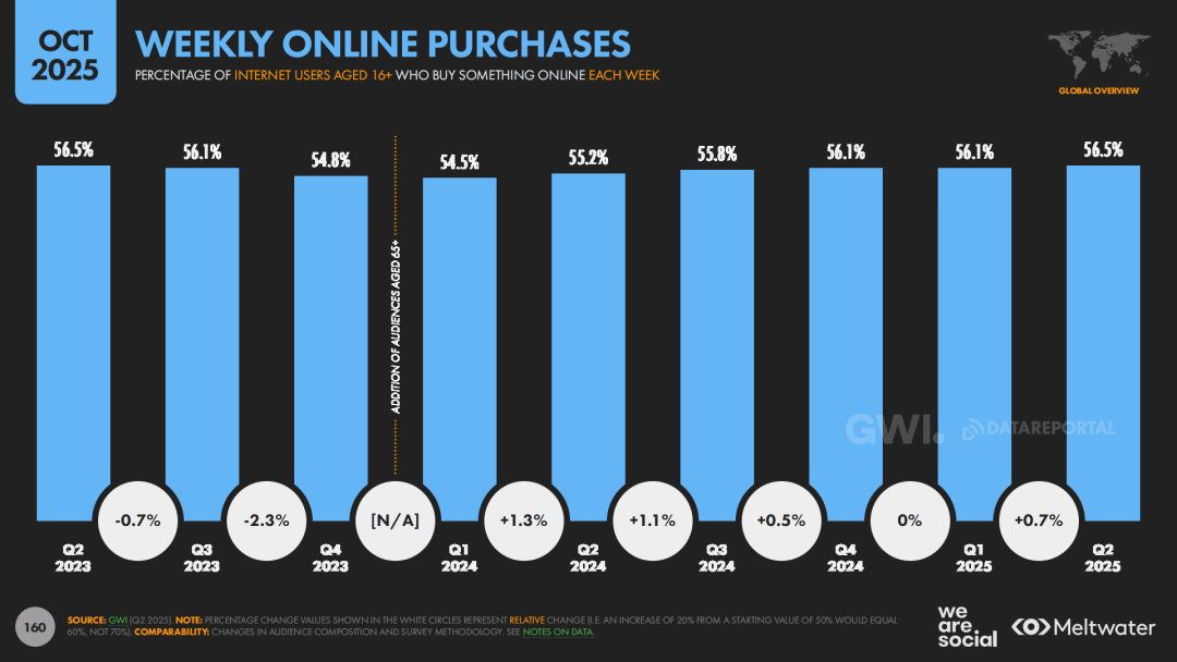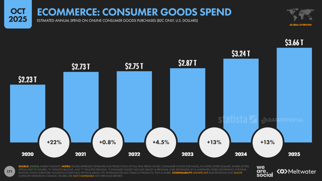 报告显示,全球B2C电商规模已达约3.66万亿美元,近两年年增长率约13%,每周进行网购的用户占比达到56.5%,“线上购物”在许多国家已经从“替代方案”变成日常生活的“默认选项”。