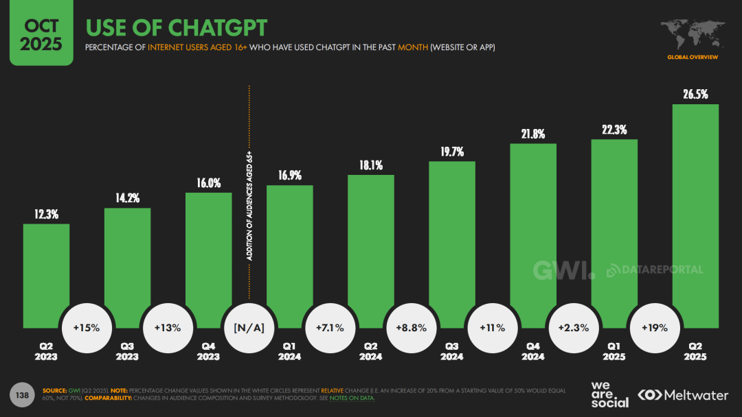 在技术层面,报告最醒目的关键词无疑是人工智能,尤其是生成式AI的迅猛扩张。报告显示,ChatGPT已成为全球增长最快的数字应用之一,使用ChatGPT的互联网用户占比不断增加,生成式AI工具的月度使用人群总体规模已迈入“十亿级”。更重要的是,AI使用场景正在全面渗透日常生活:从最初的写作辅助、学习辅导,扩展到情感陪伴、生活规划、工作决策等多个领域。AI正在从“极客工具”变成面向大众的“数字生活助手”。