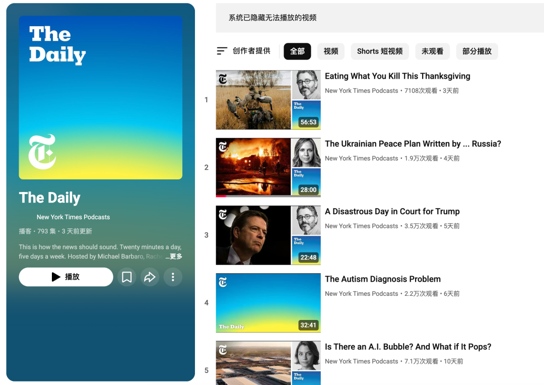 这使得视频播客的音频属性在 YouTube 上也能被有效消费,视频形式并未成为障碍,反而提供了更多元的选择。