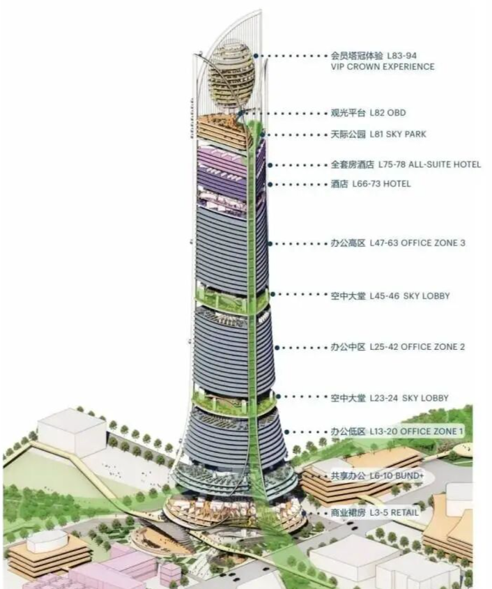 其700米高度的早期方案(后调整为668米)一度瞄准“中国第一高楼”宝座,试图超越632米的上海中心大厦。