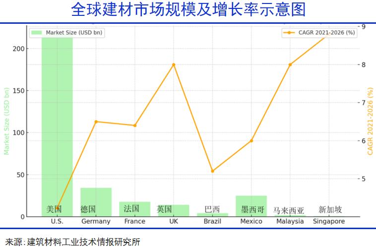 据研究显示,马来西亚、新加坡、墨西哥、巴西、中东和广阔的非洲,未来多年的建材市场规模增速都显著强于国内。