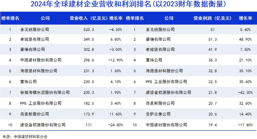 国内规模最大的中国建材,营收排名全球第四,但利润只能排在第十名。对比来看,营业利润超过20亿美元的公司均来自欧洲和北美。圣戈班1.7倍于中国建材的收入,创造了后者3倍体量的利润,充分显示了这家已经年满360岁公司的实力。