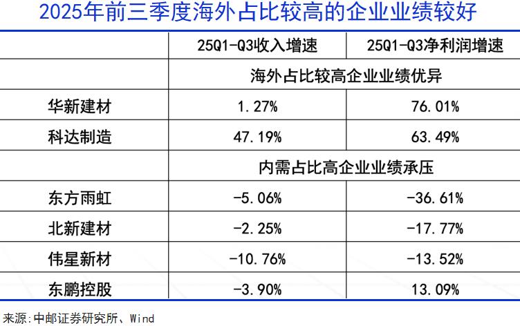 从已经发布的三季报来看,建材行业内部分化剧烈。海外占比较高的企业业绩普遍较为优异,还在依靠内需的玩家,则普遍陷入了困境。