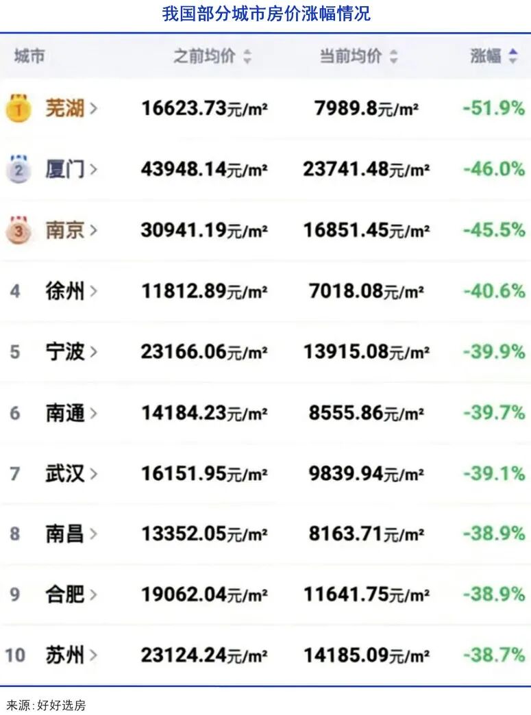 楼市数据显得极为残酷和冰冷,没有给建材企业留出太多的生存空间。过去三年,全国各地商品房价格持续阴跌,典型代表如芜湖跌52%,厦门、南京、徐州跌幅超过40%。