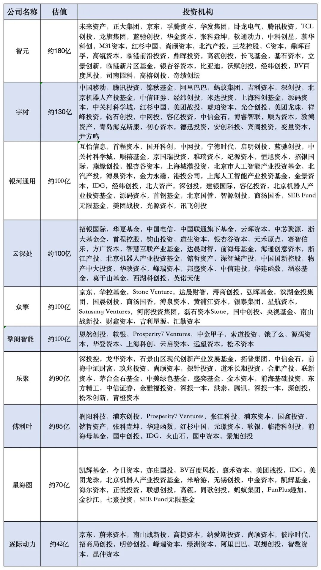 资本涌向头部公司。估值超百亿的智元、宇树、银河通用、云深处等企业,投资人名单每家都长达数十家,几乎囊括了市场一线机构。