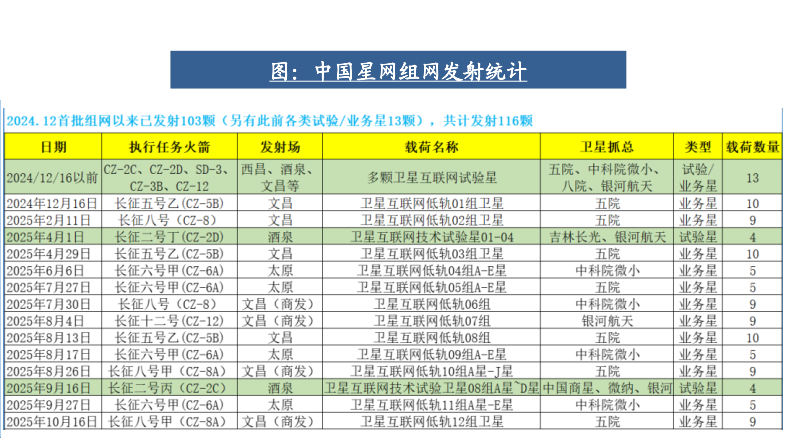 根据ITU(国际电信联盟)规定,申报7年内发射首颗卫星,9年内发射星座总数量的10%,12年内完成50%,14年内必须100%部署完毕。以中国星网规划的12992颗卫星(2020年9月申请)为例:2027年至少发射一颗卫星(已完成),2029年需在轨约1300颗(10%)2032年累计6500颗(50%)2034年:完成全部1.3万颗部署。截至2025年10月,星网共发射116颗卫星(含实验星和业务星)。