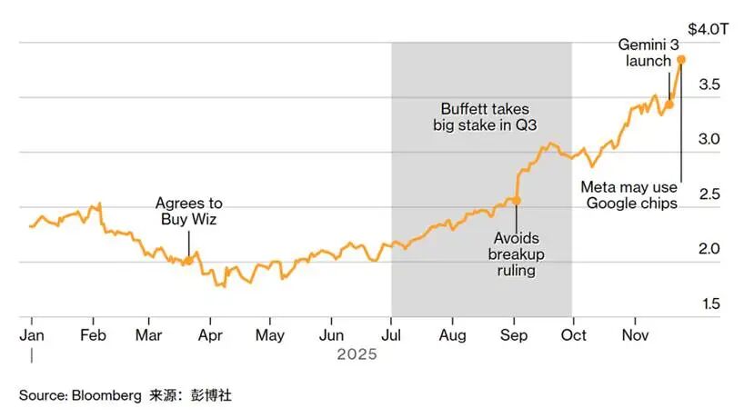 然而,风向在进入2025年下半年后发生骤变。谷歌的Gemini 3在11月发布后,其母公司Alphabet股价应声大涨,市值逼近4万亿美元大关;而曾经的AI行情“总龙头”英伟达股价却下跌近15%,OpenAI阵营的主要支持者微软和软银集团也分别下跌了5%和38%。