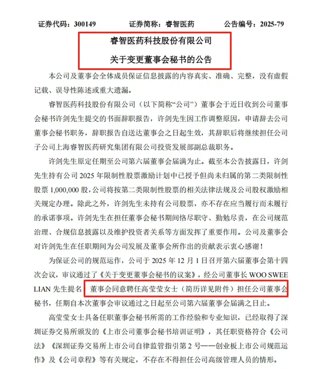 尽管公告强调其已取得董秘培训证明,具备任职资格,但缺乏医药行业积淀与资本市场实操经验的短板,仍让不少投资者提出质疑:“生物药研发生产是高度专业的领域,董秘岗位关乎信息披露准确性与资本运作效率,跨界新人能否胜任?”