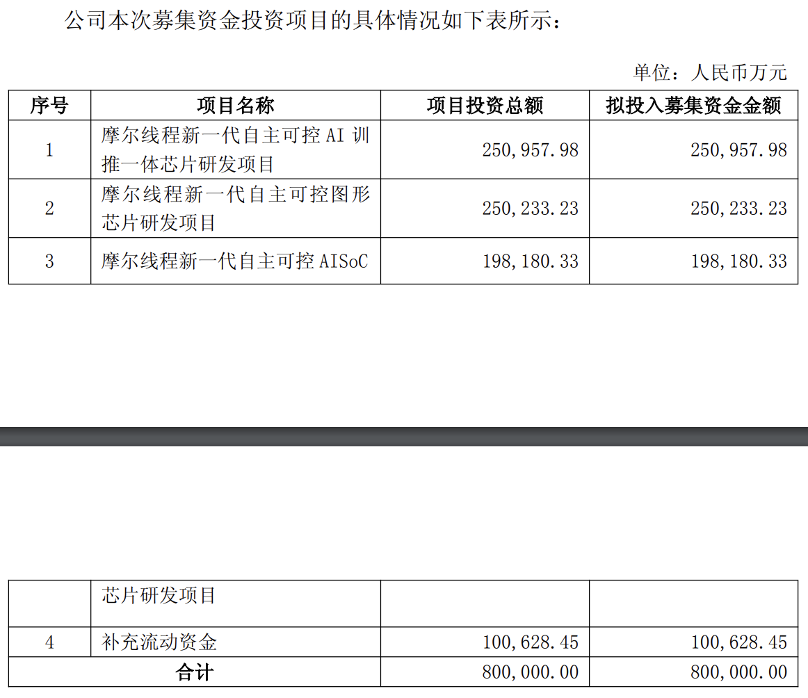 这与招股书披露的资金规划一致,除10亿用来补充流动资金外,摩尔线程剩余近70亿募集资金将用来投资“摩尔线程新一代自主可控AI训推一体芯片研发项目”“摩尔线程新一代自主可控图形芯片研发项目”“摩尔线程新一代自主可控AISoC芯片研发项目”。这三个项目的建设周期均为三年,其中“研发投入”是所有项目的核心投入项,根据各项目的研发进度规划,将在三年内持续投放。