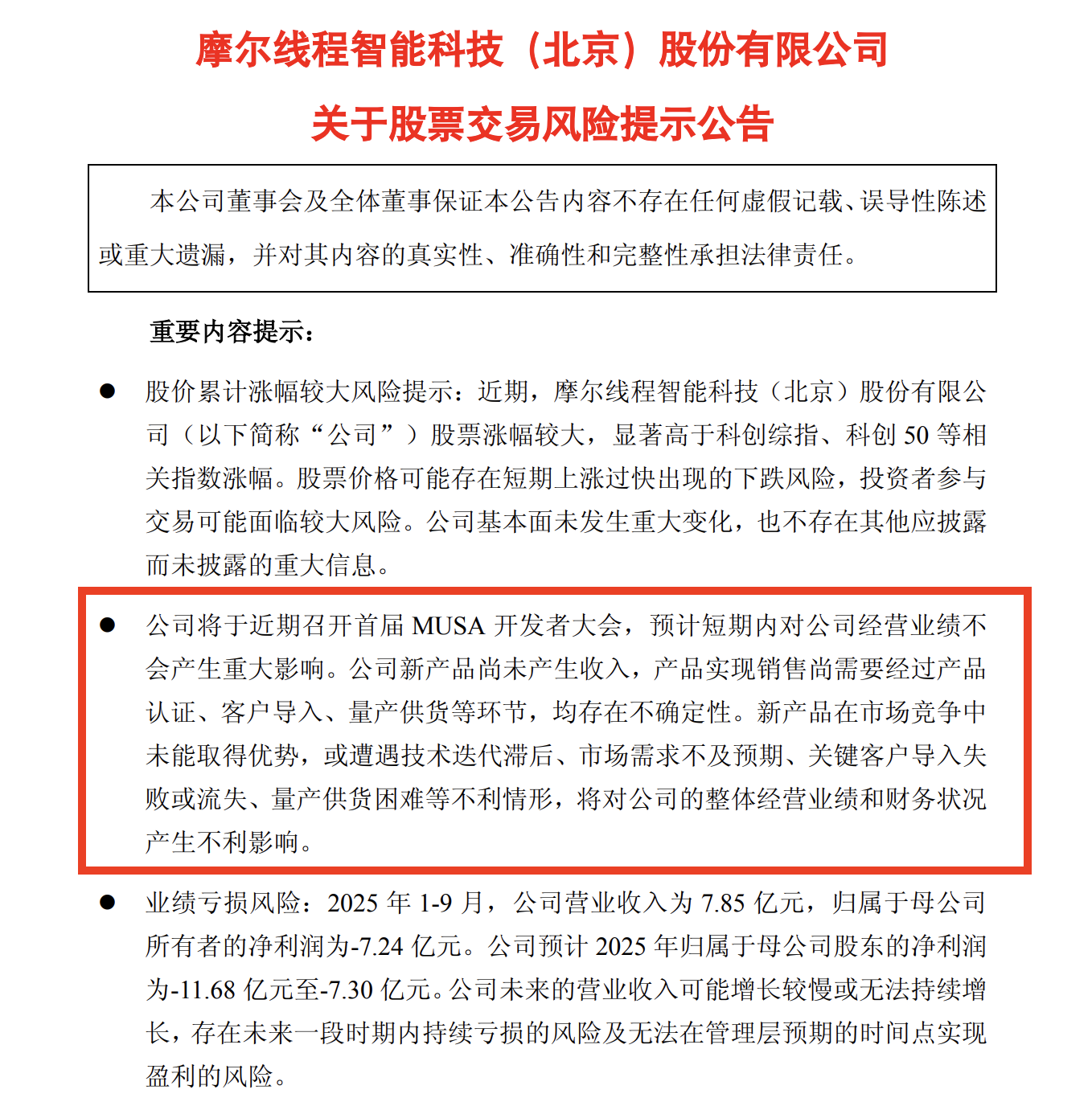 狂热行情未能持续,12月11日晚,摩尔线程发布风险提示公告紧急“降温”,称“近期召开首届MUSA开发者大会,预计短期内对公司经营业绩不会产生重大影响。公司新产品尚未产生收入,产品实现销售尚需要经过产品认证、客户导入、量产供货等环节,均存在不确定。”