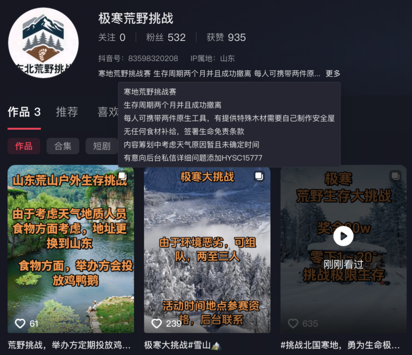 个人账号发布东北极寒荒野求生赛