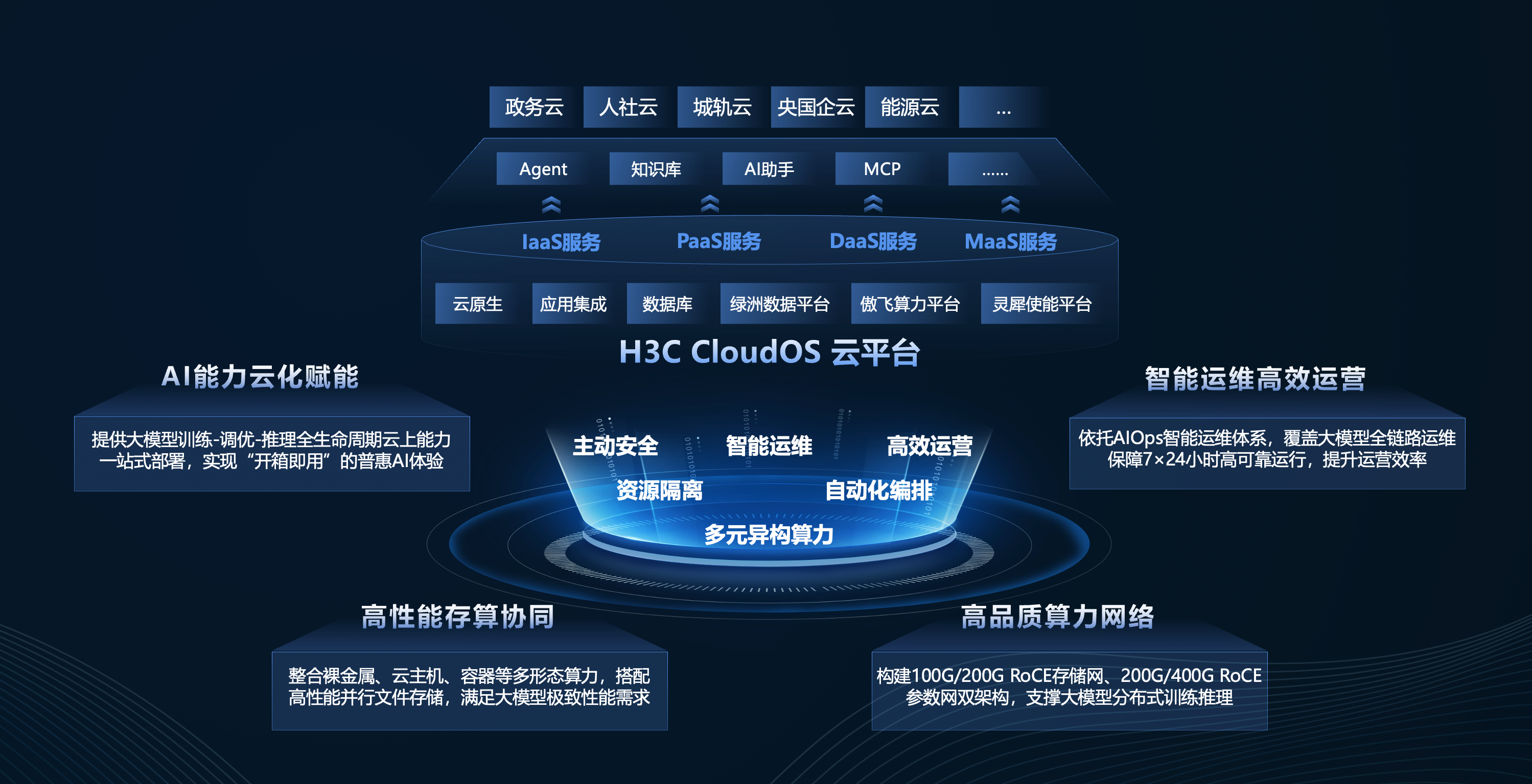 新华三CloudOS云平台通过全面实现通智融合架构,彻底打通通算、智算、高算的架构壁垒,构建起“算存网智”一体化协同体系。