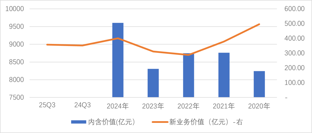 从保单继续率来看,中国平安20年、21年、22年为低谷期,23年及以后修复明显。公司内含价值在不断提升,24年末寿险业务内含价值9606.08亿元,较21年增长了16.5%。25年前三季度新业务价值357.24亿元,同比增长1.6%,主要是低利率环境下息差收窄所致。