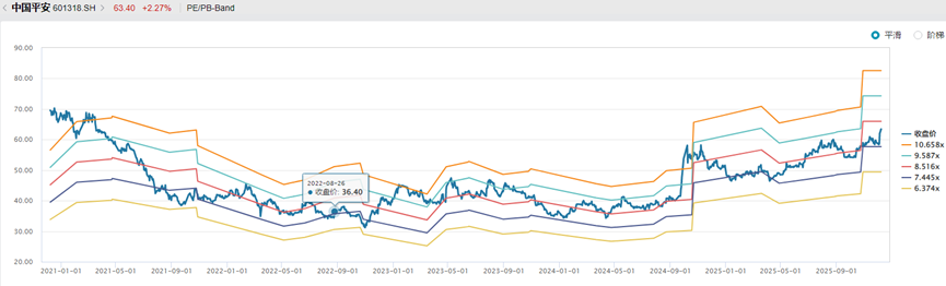 截至2025年12月15日,中国平安市盈率(PE)为8.6倍,市净率(PB)为1.23倍,股息率约4%。从PB看,中国平安是A股上市保险公司中估值最低的;从PE看,仍较同业有一定溢价。