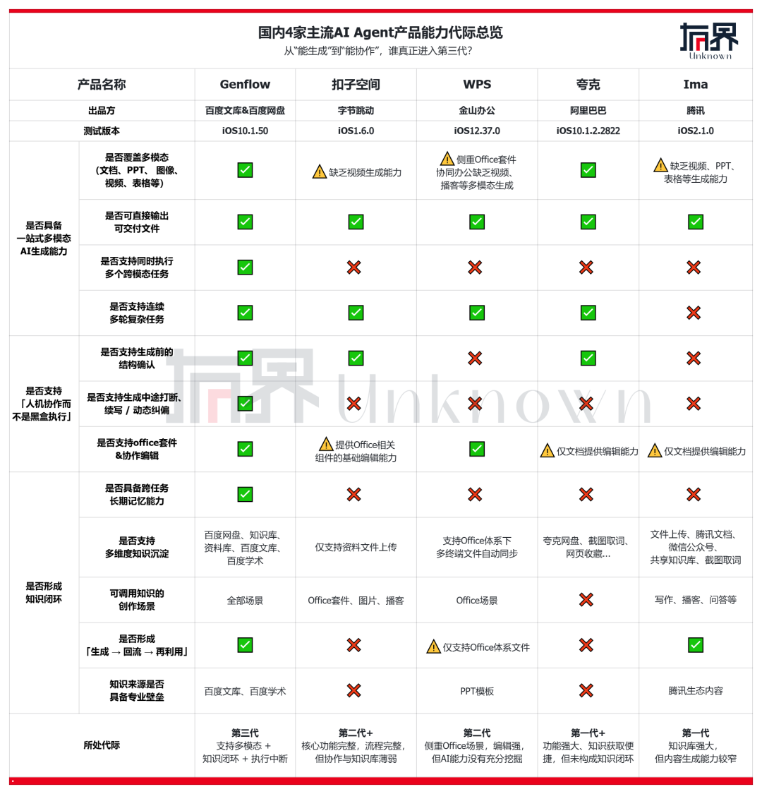 带着这些问题,我们挑选了目前国内5家主流大厂系Agent进行实测:百度GenFlow3.0、腾讯ima、金山WPS.AI、扣子空间、夸克。而通过5款产品测评后,我们发现3次代际分层正在出现: