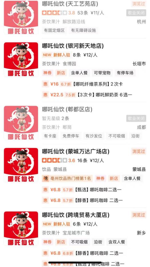 大众点评显示,哪吒仙饮在全国共开设了5家门店,其中3家为新店,仍在正常营业,另外2家则处于“歇业关闭”状态。