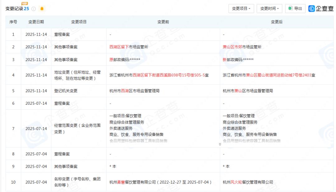 7月,公司名字从“杭州勇慧餐饮管理有限公司”改成“杭州风火轮餐饮管理有限公司”。