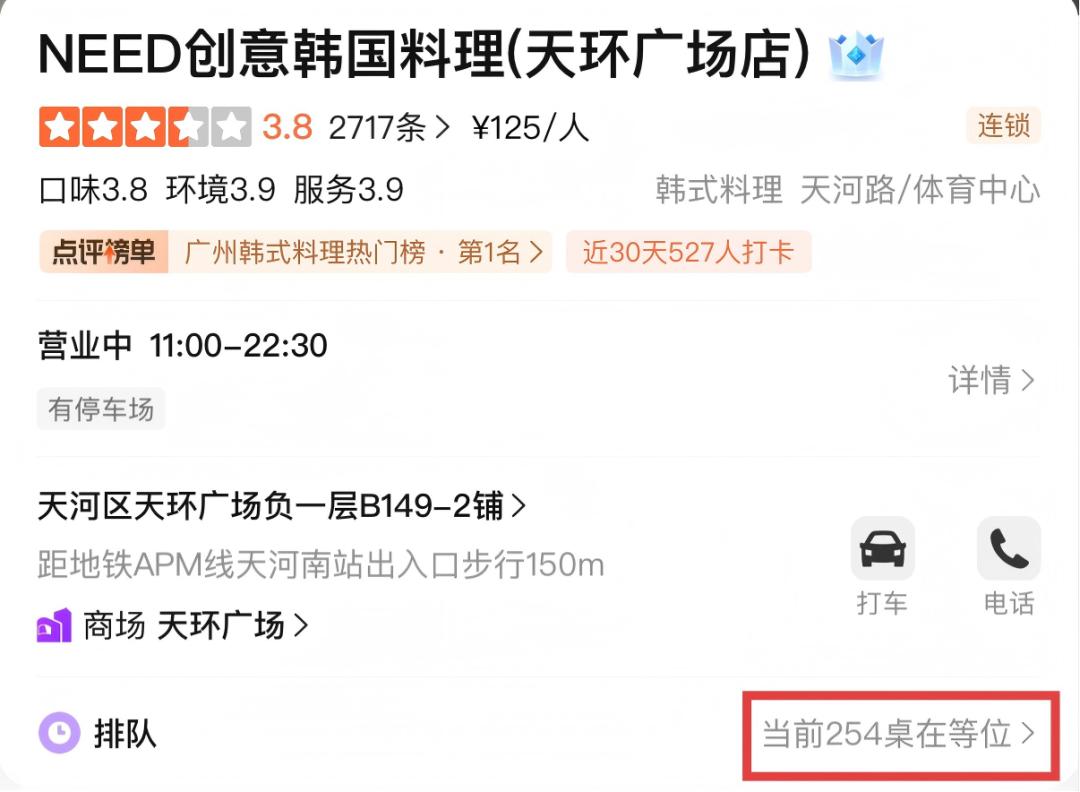 △晚上七点左右,NEED创意韩国料理广州门店需等位超200桌,图片来源:大众点评