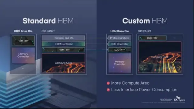 SK 海力士认为,随着AI市场从商品化拓展到推论效率和优化,未来HBM也将从传统的产品演变为定制化的产品。定制化HBM(Custom HBM)就是把GPU和ASIC的特定功能整合到HBM 基座上的产品。这样做的结果有两个:一是让GPU或ASIC的性能发挥得更充分;二是减少HBM和处理器之间的数据传输功耗。