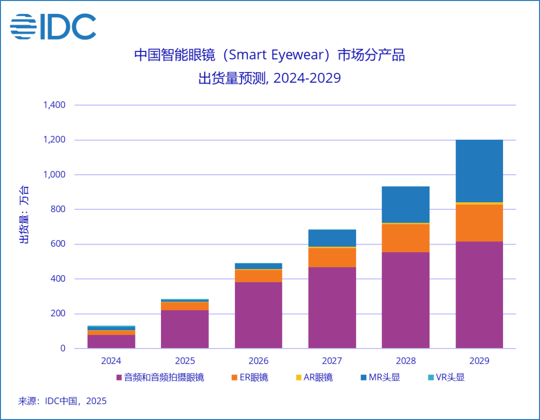 或许,价格便宜是当前AI音频眼镜能成为市场份额最大产品的原因。根据IDC统计数据显示,AI眼镜真实销量的大头就是AI音频类。而且,短期未来的趋势也不太会发生变化。