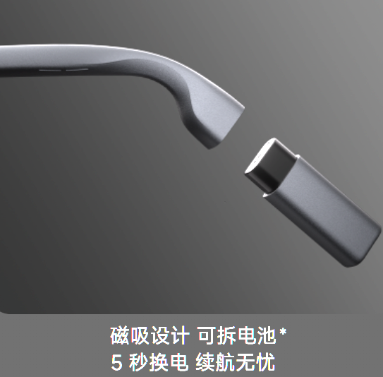 续航方面,目前这部分类型眼镜都不太长,6h是一个相对平均的标准。行业目前有效的解决方案不多,相对还不错的是影目INMO GO3和夸克AI眼镜 S1的支持“换电”设计。通过连续更换电池的方式,改善眼镜整体续航时间。此外,Rokid给眼镜做了插在镜腿上的“充电宝”,虽然佩戴更重了,但也算是能提供无缝续航。