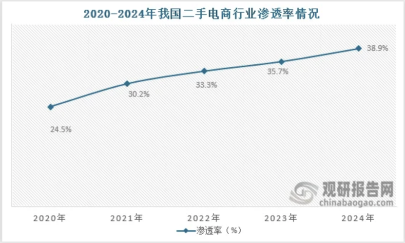 二手电商的渗透率也在不断提升,从渗透率来看,2020年到2024年我国二手电商行业渗透率从24.5%增长到了38.9%。