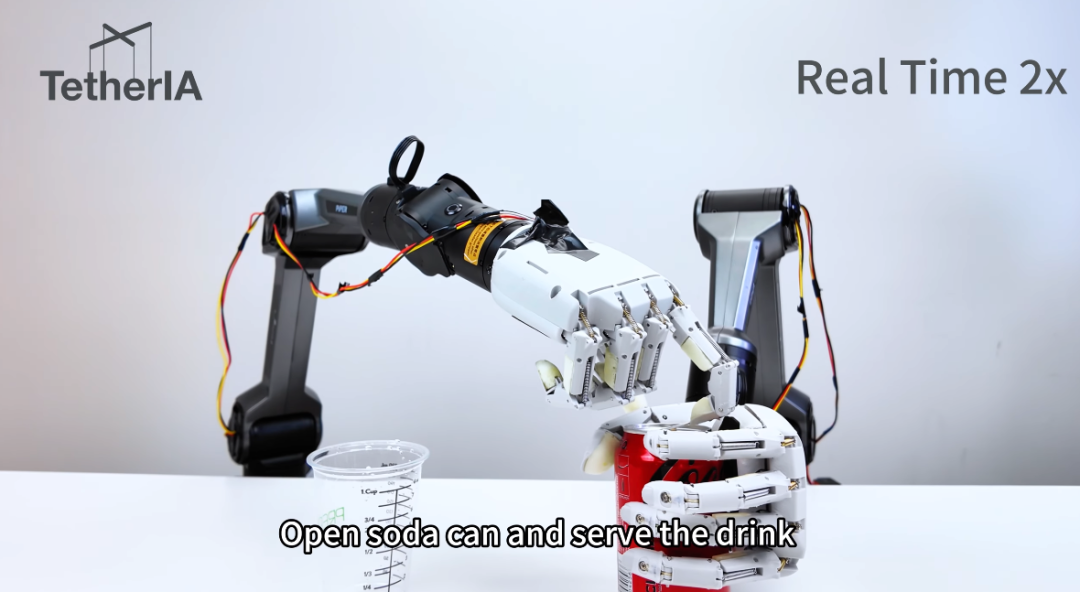 陶一伟:没错,这个是一个非常好的问题。首先开可乐本身,看似只要一双手,再加上一个指甲就可以实现,但是真正把它放到一个双臂机器人系统上,还是非常有挑战的工作,而我们也只是浅浅Demo了一下,未来还有非常多的工作,怎样能让整个事情变得完全自动地实现起来,并且成功率非常高地去实现,还是一个很长的路要走。