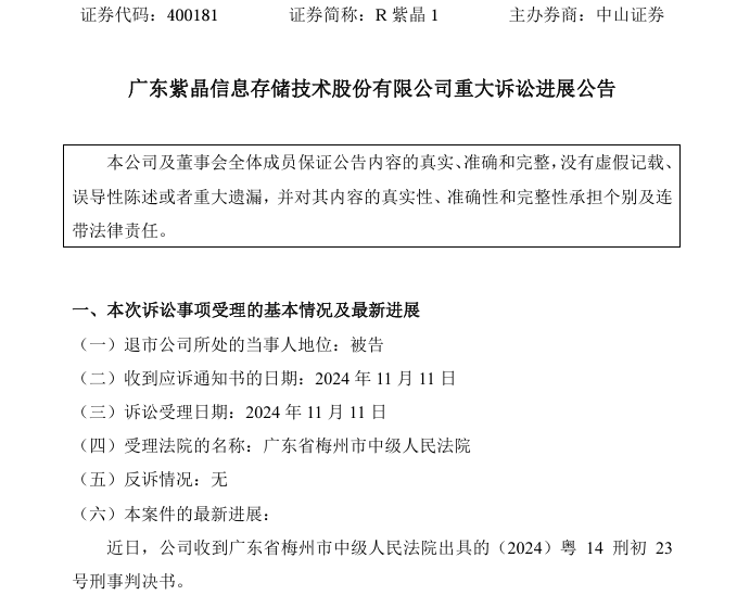 12月12日,已经退市的紫晶存储发布公告称,公司近日收到广东省梅州市中级人民法院出具刑事判决书【(2024)粤 14 刑初 23号】,公司实际控制人郑穆、罗铁威及原财务总监李燕霞等10名管理人员,均被判处有期徒刑。