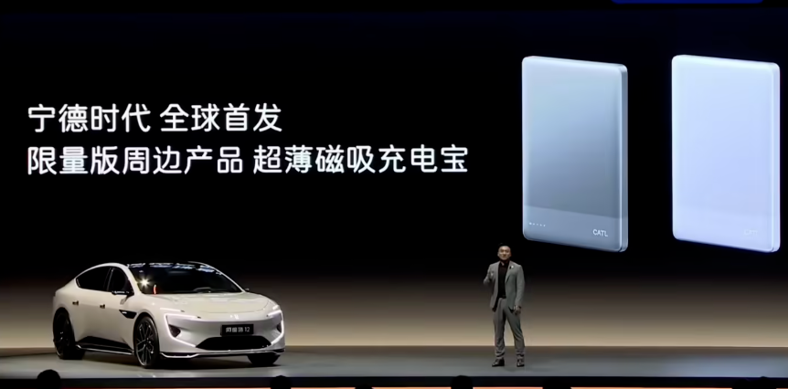 今年10月的阿维塔12四激光版车型发布会上,作为供应商的电池巨头宁德时代登场,意外带来了一款超薄磁吸充电宝。其外观和小米超薄充电宝类似。