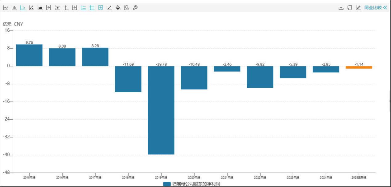 今年前三季度依旧延续亏损情况,报告期内公司实现营收2.15亿元,同比下降46%;实现归母净利润-1.14亿元。而截至2024年底公司已经连续亏损7年,累计亏损超80亿元。