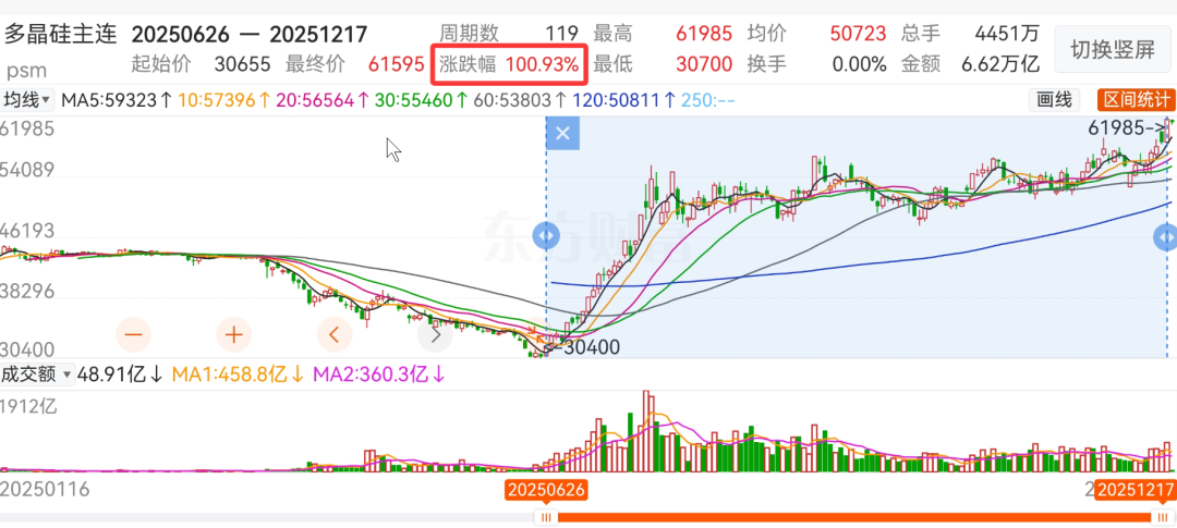 光伏反内卷的成果,表现在资本市场中,成绩有目共睹:多晶硅主力连续合约从2025年6月26日的30655元,一路上涨到12月17日的61595元,涨幅刚好为100.93%!放大到10倍杠杆,就是涨了10倍!