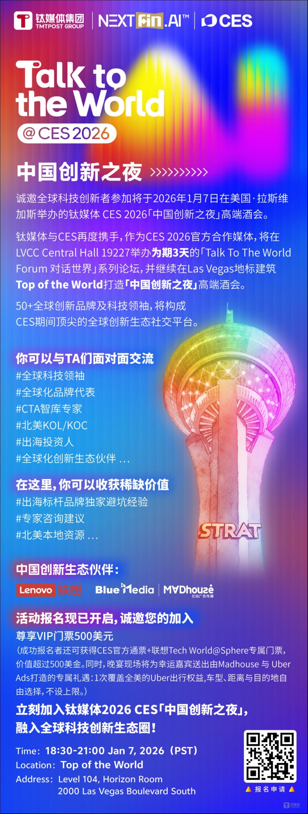 If the TMTPost Media Stage is the best platform to make your voice heard during CES, then the exclusive "China Innovation Night" cocktail party—set for January 7th, 6:30 PM to 9:00 PM (PST) at the iconic Las Vegas venue TOP of the World—is the core social circle connecting Chinese innovation and technology with the global stage.