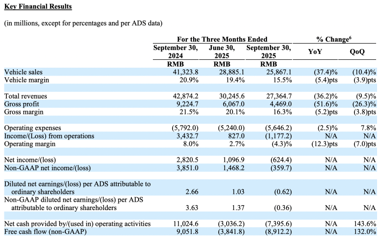 根据其在 11 月下旬发布的最新财报,理想汽车在 2025 年 Q3 的营收为 274 亿元,去年同期为 428.7 亿元;毛利为 45 亿元,去年同期为 92 亿元,同比下滑 51.6%——毛利率为 16.3%,而去年同期为 21.5%。