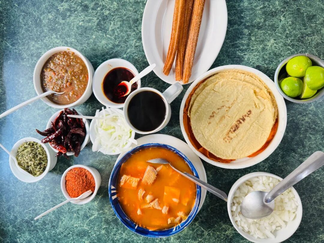 这家店并不便宜,三种taco混装96元人民币(247比索),饮料另计,每天从下午就开始排队。本地人喜欢去的Rica Pancita Anita,招牌是牛杂早餐,一个套餐包括牛杂,墨西哥油条,咖啡等71元人民币(185比索)。