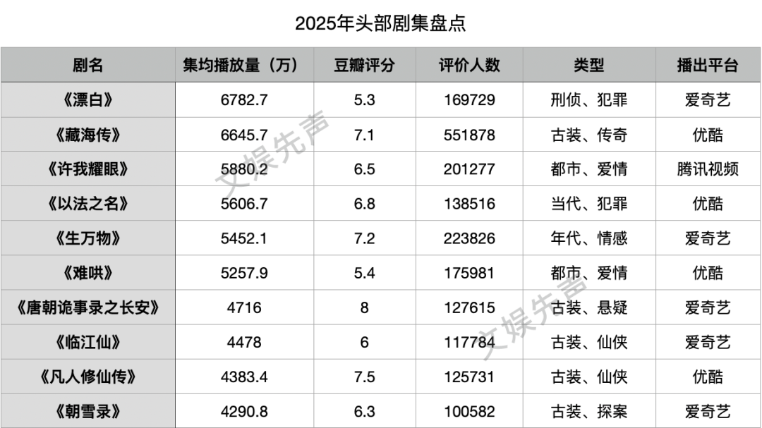 以灯塔数据为例。从其公开数据来看,2025年的头部剧集依然维持了可观的基本盘,整体集中在4200万至6800万这一密集区间内。其中,《漂白》与《藏海传》以6782.7万和6645.7万的集均播放量分列年度冠亚军,两者差距小于200万。而《许我耀眼》《以法之名》《生万物》等剧则紧随其后,形成紧密咬合的态势。