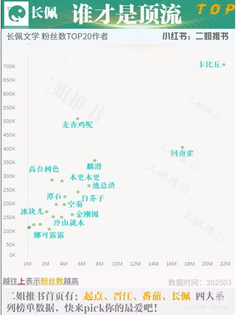 卡比丘并非长佩唯一的“一姐”。回南雀、麦香鸡、清明谷雨等作者,都是这两年长佩文学里最头部的作者,在站内拥有着接近数十万量级的粉丝群体。