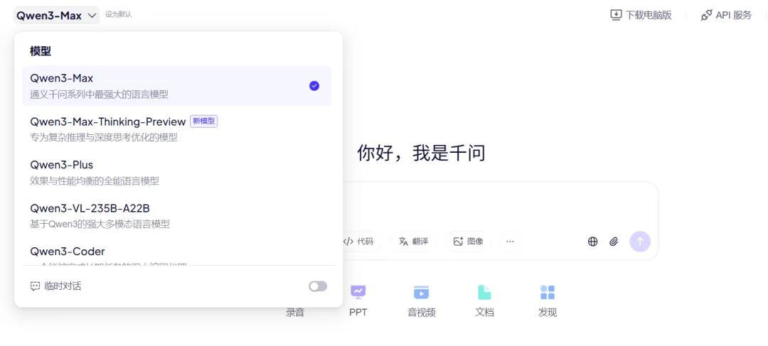 而通义在改名为千问后,这款 AI 应用同步实现了版本号的跨越式升级,由3字头直接升级至5.0,UI界面发生重大变化,整体布局对标 ChatGPT 的简洁交互逻辑。